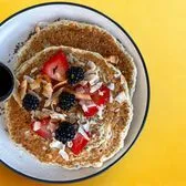 greek yogurt, house granola with oats, nuts, seeds, dried fruit, & honey with banana, berries, cocoa nibs, goji berries, & coconut flakes