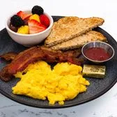 two vital farms eggs any style, bacon, multigrain toast, seasonal fruit [sub grits +1]