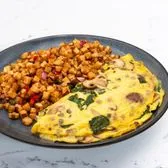 three vital farms eggs*, spinach, shallots, crimini mushrooms, white cheddar, & side of skillet potatoes