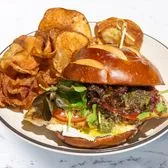 american cheese, sliced tomato, house made dill pickles, shaved red onion, lettuce, garlic aioli, brioche bun with crispy fries(Contain gluten) ([add bacon +2.75, avocado +2.50, egg +2.25, sub plant protein +0]