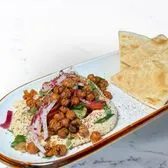 [new] chickpea hummus, marinated tomato, cucumber, pickled red onions, crispy chickpeas, olive oil, basil, mint, dill, radish & sumac with warm pita bread [extra pita +2.25]