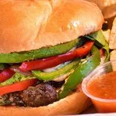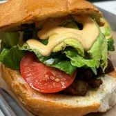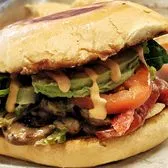 MUSHROOMS, BELL PEPPERS, ONIONS, TOSSED IN QUESO WITH LETTUCE, TOMATO, AVOCADO AND DRESSING ON A TOASTED BUN