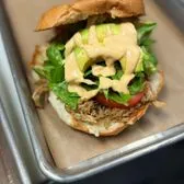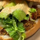 SHREDDED PORK TOSSED IN CHIPOTLE SALSA WITH LETTUCE, TOMATO, AVOCADO AND DRESSING ON A TOASTED BUN.