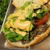 3 OZ CARNE ASADA (STEAK), 3 OZ VEGGIES, MUSHROOMS, BELL PEPPERS, ONIONS, TOSSED IN QUESO WITH LETTUCE, TOMATO, AVOCADO AND ELOTE DRESSING ON A TOASTED BUN