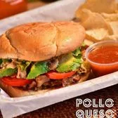 CHICKEN, MUSHROOMS, BELL PEPPERS AND ONIONS TOSSED IN QUESO WITH LETTUCE, TOMATO, AVOCADO AND DRESSING ON A TOASTED BUN