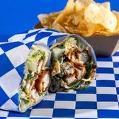 Fried Chicken Cutlet, Caesar Salad, Shaved Parmesan, and Crispy Fried Onions. Served with chips and a pickle spear.