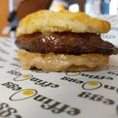 Fresh Baked Biscuit, EFFY SAUCE, Turkey Sausage, over medium egg, & Cheddar Cheese!