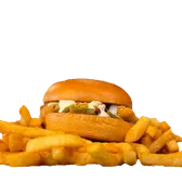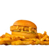 Chicken Fingers + Pickles + Bird Sauce served on a brioche bun, stacked with value fries on the side