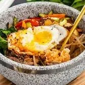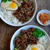Ribeye marinated in soy garlic served with rice, 1 pc dumpling, and fried egg, green onions and cilantro