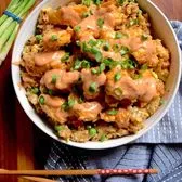Fried chicken marinated in Japanese bang bang sauce served with rice, 1 pc dumpling, and fried egg, green onions and cilantro