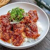 Fried Chicken marinated in sweet & spicy served with rice, 1 pc dumpling, and fried egg, green onions and cilantro