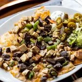 Fajita nachos with beans, cheese,bell peppers, onions,guacamole,lettuce,sour cream jalapenos