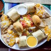 Assorted favorites!nachos,spicy chicken flaquitos,quesadilla,queso and stuffed jalapenos
