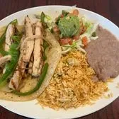 One chicken fajita taco with grilled onions, and bell peppers, guacamole, pico de gallo, rice and your choice of beans