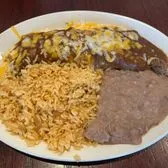 two beef enchiladas with Tex-Mex sauce, rice and your choice of beans