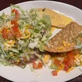 one cheese enchilada with Tex-Mex sauce and one crispy taco lettuce, tomatoes and cheese with rice and your choice of beans