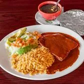 Served with rice and your choice of beans, your favorites sauce and filling Fillings: Beef | Spicy chicken | Mushroom | Cheese Sauces: Chil(TexMex) | Verde (Tomatillo) | Chipotle (Smoked Jalapeno) | Ranchero (Tomato Veggie) | Mole (Family Recipe) | Sour Cream Sauce