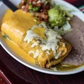 Steak Fajita wrapped in a flour tortilla with rice and cheese, lightly fried and topped with verde and queso sauce. Served with guacamole, lettuce, pico de gallo, and your choice of beans