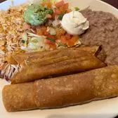 Two cheese enchiladas with tex mex sauce, crispy beef taco, queso chip, guacamole salad, rice and your choice of beans