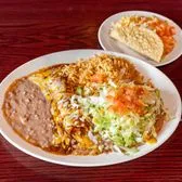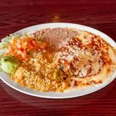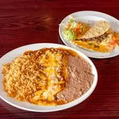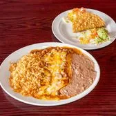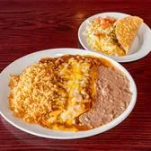 Two cheese enchiladas with tex mex sauce, crispy beef taco, rice and your choice of beans