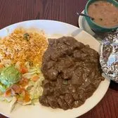 Mexican beef tips in gravy sauce served with guacamole salad, rice and your choice of beans