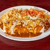 Ground beef or cheese and beans with tex mex sauce, or spicy chicken and beans with verde sauce and topped with cheese served with rice, lettuce and tomatoes