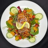 Spring salad mix topped with carrots, red bell pepper, mandarin oranges, cilantro, sesame seeds, toasted almonds, crispy wonton strips and marinated chicken breast. Served with sesame soy dressing. *Make GLUTEN FREE: Cut Wontons