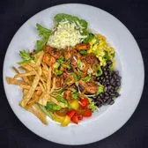 Ancho marinated chicken, black beans, roasted corn, jack cheese, cherry tomatoes, red bell pepper and crispy tortilla strips on a bed of romaine lettuce. Served with chipotle-lime vinaigrette. *GLUTEN FREE