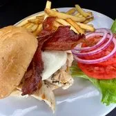 All natural, free-range chicken breast on a fresh baked bun with fresh mozzarella cheese, hickory smoked bacon, green leaf lettuce, red onion, tomato & mayo. Add Avocado for an extra charge. Served with a side of your choice. *Make GLUTEN FREE: Substitute GF Bun