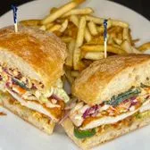 Fried chicken breast topped with cabbage slaw, fresh jalapenos, homemade pickles and chipotle mayo on ciabatta bread. *Contains GLUTEN