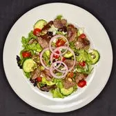 Grilled steak, blue cheese, pumpkin seeds, avocado, cucumber, field greens, cherry tomatoes, blue cheese vinaigrette.