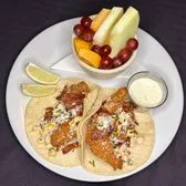 Fried chicken strips, mexican street corn blend (mayo, Tajin seasoning, green onion, cilantro, corn), bacon, and cotija cheese all wrapped in corn tortillas. Served with your choice of side.