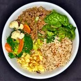 Glazed salmon bites, rice pilaf, pickled cucumber, pickled red onion, edamame, red cabbage, carrot, sesame seeds, Sriracha aioli.
