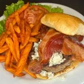 Hamburger patty on a fresh baked bun with bleu cheese crumbles, hickory smoked bacon, green leaf lettuce, red onion, tomato & mayo. Served with a side of your choice. *Make GLUTEN FREE: Substitute GF Bun