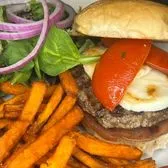 Hamburger patty on a fresh baked bun with sliced prosciutto, fresh mozzarella, and balsamic roasted tomato. Served with mixed field greens & pesto mayo on the side. Add Avocado for an extra charge. Served with a side of your choice. *Make GLUTEN FREE: Substitute GF Bun