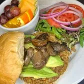 Our homemade vegan patty on a fresh baked bun topped with sliced avocado & sautéed mushrooms. Served with mixed field greens, tomato, red onion & pesto mayo on the side. Served with a side of your choice. *Make GLUTEN FREE: Substitute GF Bun