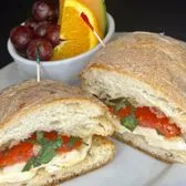 Fresh mozzarella cheese with basil and balsamic-roasted tomatoes on ciabatta bread, drizzled with olive oil. Add prosciutto or avocado for an extra charge. Served with a side of your choice. *Make GLUTEN FREE: Substitute GF Bread