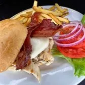 All natural, free-range chicken breast on a fresh baked bun with fresh mozzarella cheese, hickory smoked bacon, green leaf lettuce, red onion, tomato & mayo. Add Avocado for an extra charge. Served with a side of your choice. *Make GLUTEN FREE: Substitute GF Bun