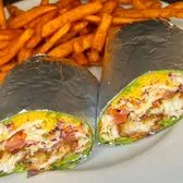 Fried chicken tenders, bacon, cheddar cheese, roma tomato, green leaf lettuce, and whole grain mustard aioli. Served with a side of your choice. *Make GLUTEN FREE: Substitute GF Tortilla, Substitute Grilled Chicken