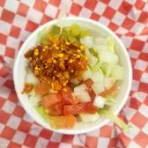 A cup of our special garnishes- lettuce, tomato, pickle, onion, and sweet cherry peppers.