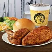 Golden roast chicken, single side, 30 oz drink, fresh-baked roll.