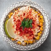 Fire-roasted Street Corn served with creamy mayonesa, queso fresco, ground red chiles, y limon