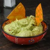 Fresh made Guacamole served on a bed of shredded lettuce with tortilla chips