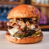 Burger patty topped with roasted pork, Swiss cheese, crispy onions, pickles, mayo & mustard