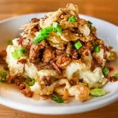 Four cheese mac, roasted BBQ pork, crispy onions, chopped bacon, green onion, & BBQ sauce.