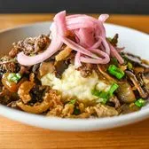 Four cheese mac, chopped beef patty, sauteed mushrooms, green, carmelized & pickled red onions.