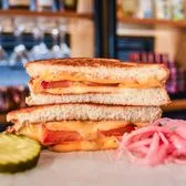 Texas toast with Swiss, Cheddar, Pepper Jack & Yellow American cheese, and a roasted tomato. Served with side of pickles and pickled red onions.