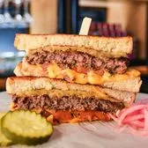 Texas toast loaded with a burger patty, Swiss, Cheddar, Pepper Jack & Yellow American cheese, and a roasted tomato. Served with side of pickles and pickled red onions.