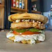 Ground & pesto seasoned turkey patty, bacon, Swiss, sprouts, avocado & Chipotle Aioli.