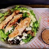 Our Happy Salad, made with Field Greens, Candied Walnuts, Cucumbers, Dried Cranberries, crumbled Blue Cheese. Served with our homemade Balsamic Dressing and your choice of our delicious chicken!